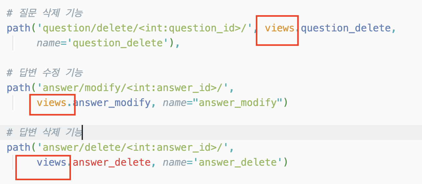 이 부분을 보고 "아! views에 answer_delete를 정의하지 않았구나!