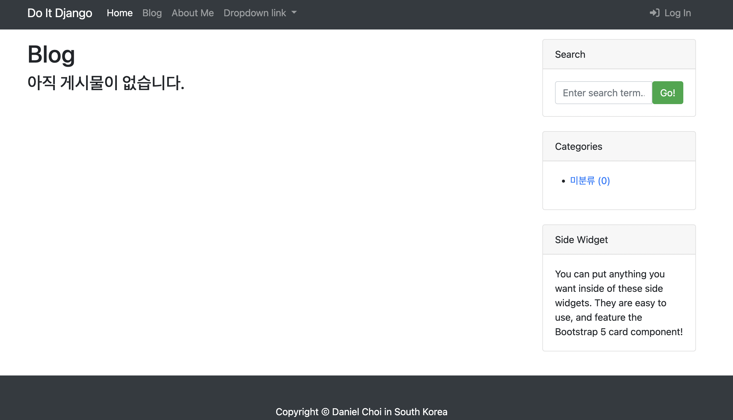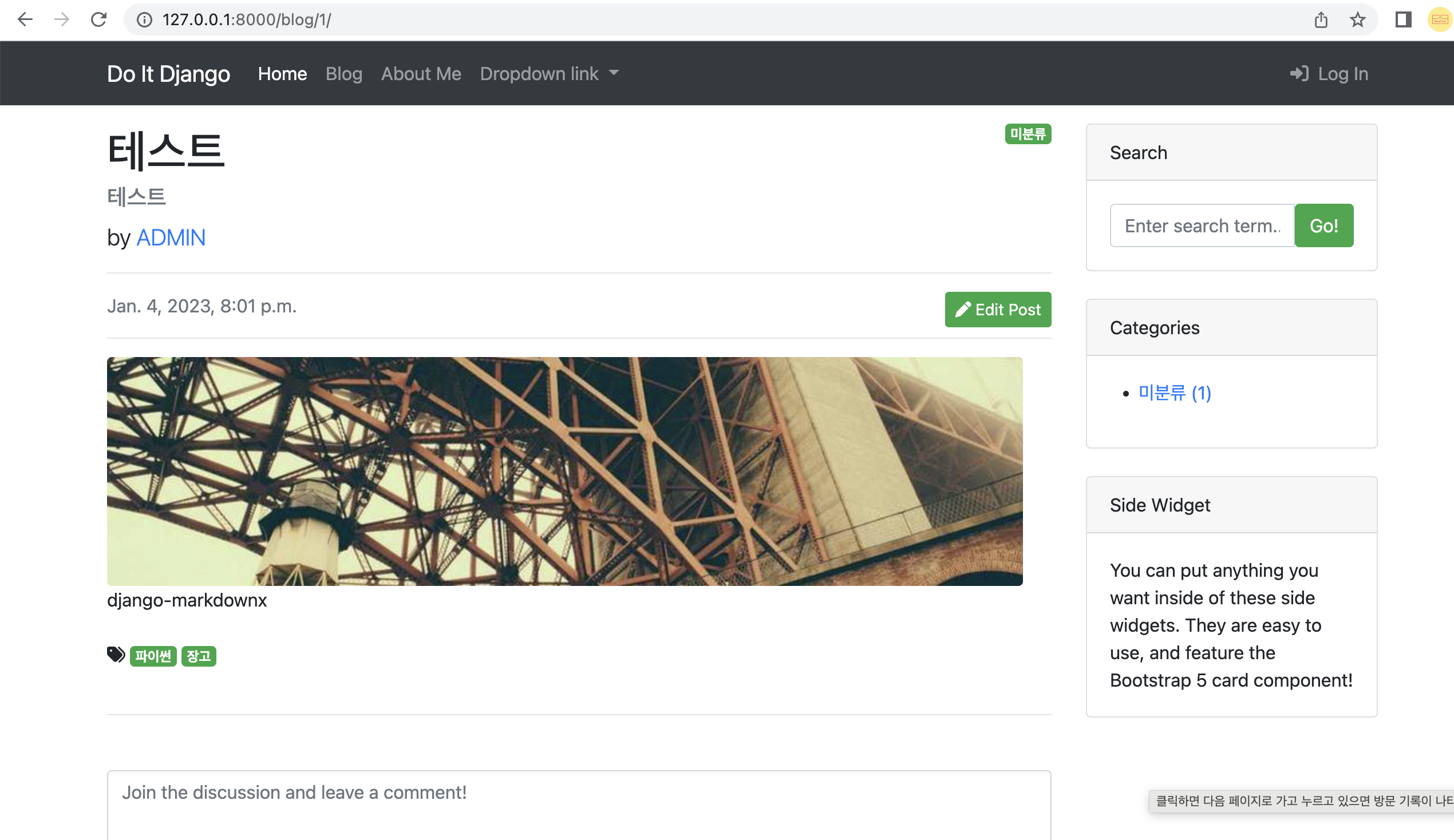 현재 진행하는 교재가 "Do it 장고+부트스트랩 파이썬 웹개발의 정석" 이라는 책으로 진행하고 있다.