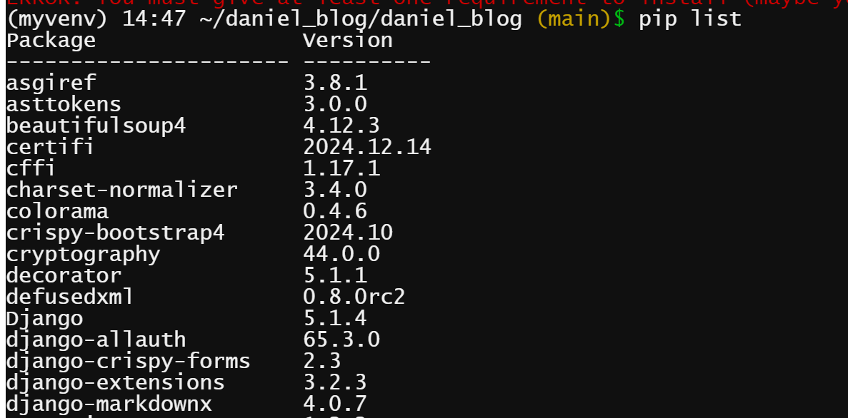 이와 같이, bash 터미널에서 pip list를 해보면, django 설치가 되어있다.
